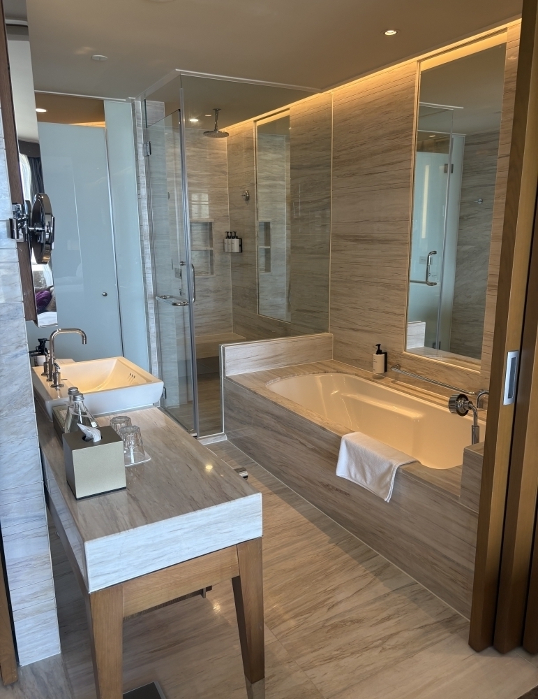 [バスルーム]トイレとシャワーが別で使いやすい。湯船が部屋の真ん中にあり、ロールカーテンはあるが1箇所だけで備え付けの鏡に写ってしまうため利用せず。湯船は大きめだった。湯船の脇にシャワーもついている。