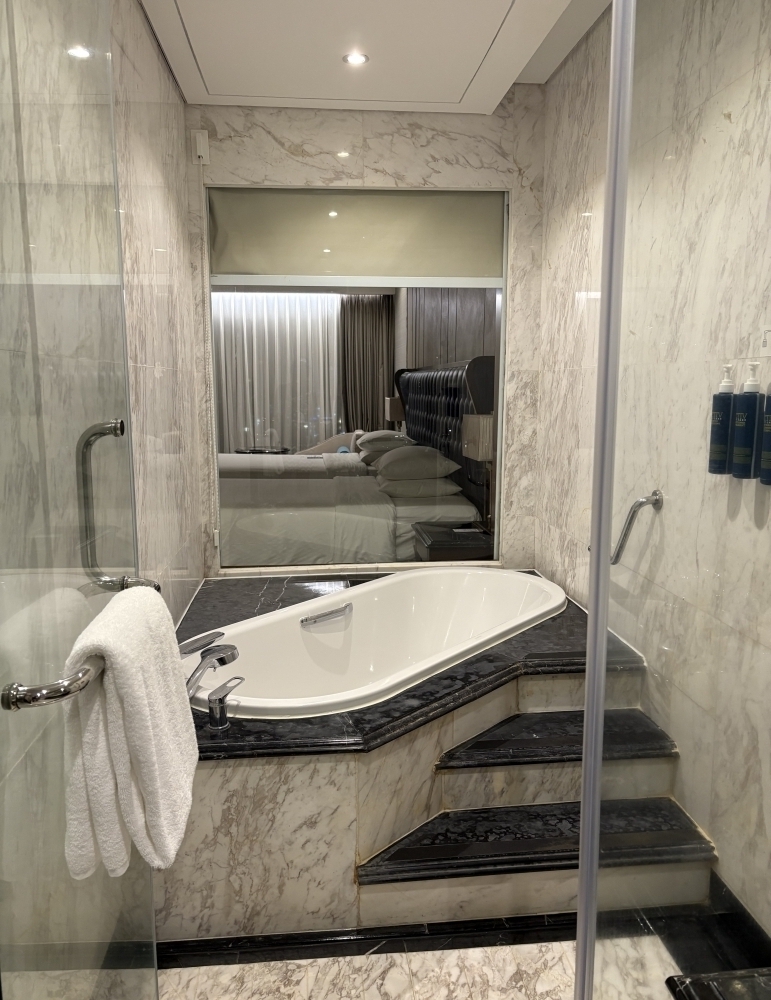 ガラス張りで、トイレもガラス張り。浴槽は大きく、シャワーを使っても床がビチャビチャになりませんでした。