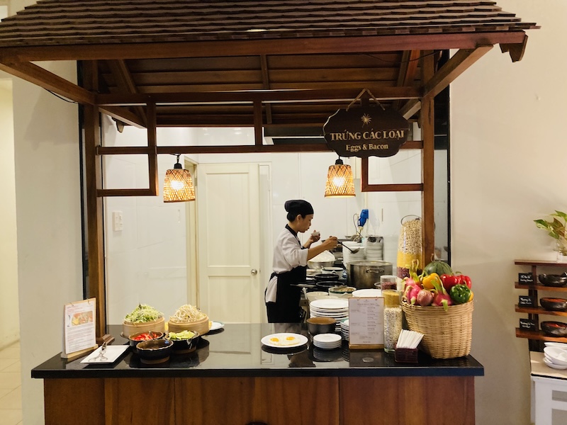 [食事]ベトナムのローカルフードが楽しめ、ライブキッチンもありました。毎日少しずつ違うメニューもあり、どれも美味しかったです。昼食でホテルのレストランにてピザを食べました。ピザも美味しいですがステーキサンドのお肉が驚くほど柔らかく美味しかったです。アフタヌーンティーもあります。
