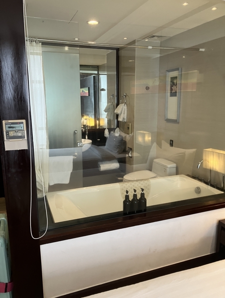 [バスルーム]ガラス張りで落ち着かない。カーテンはあります。水量は普通です。