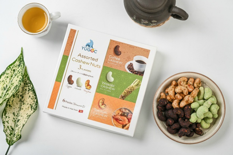 ベトナム産カシューナッツを使い、コーヒー(ベトナム)・わさび(日本)・トムヤム(タイ)の3種類のフレーバーを楽しめるおやつお土産。アジアを代表する3か国とあって欧米人旅行者の間で大人気とのこと。パッケージデザインもハイセンス。