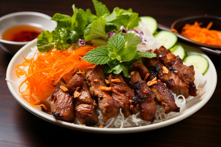 Bun Thit Nuong/ブン・ティッ・ヌンは、ベトナム南部ホーチミンを象徴する名物料理です。スープはなく、別途はついてくるヌクマムベースのタレをかき混ぜる食べ方が特徴。